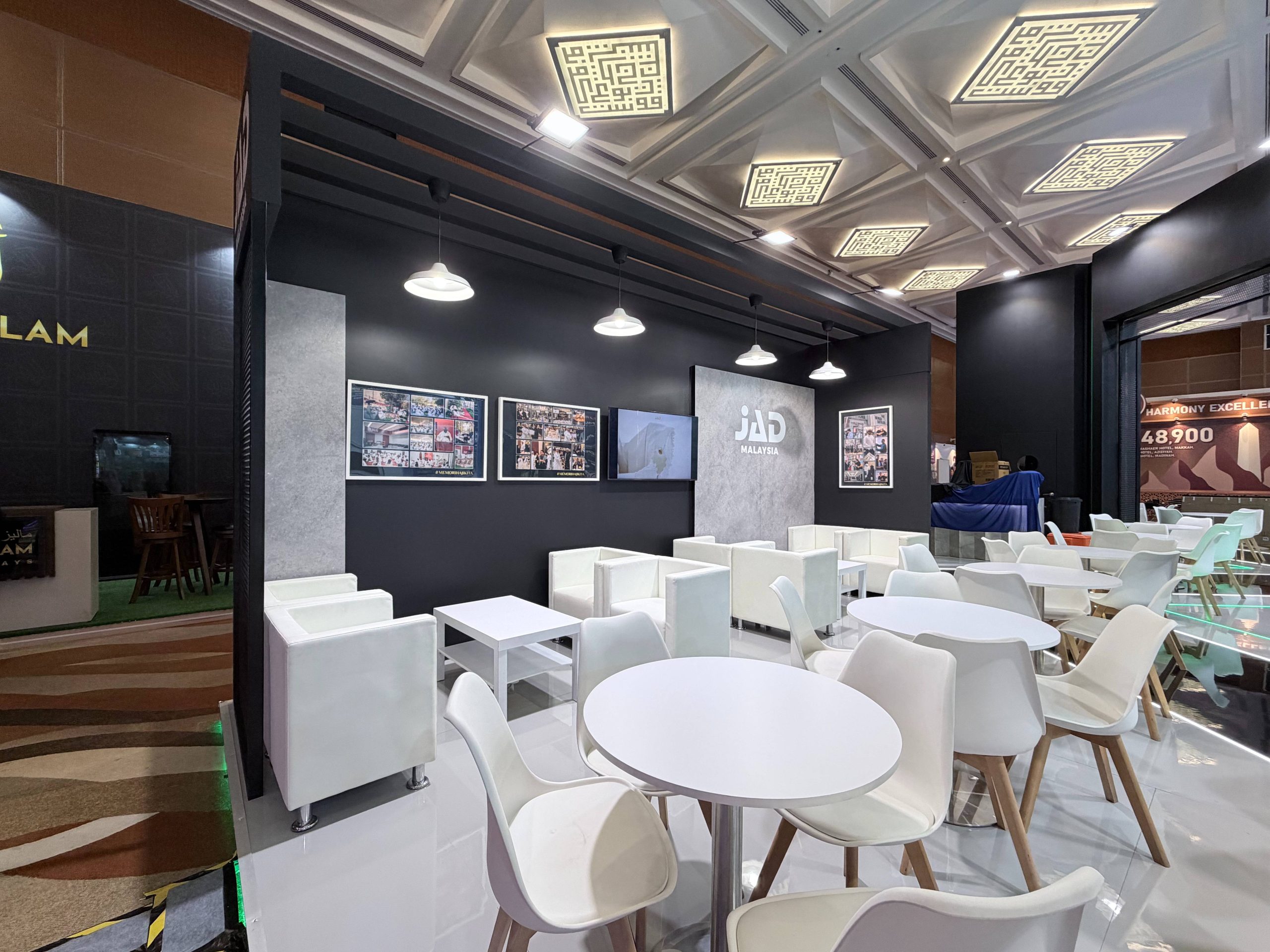 Inside, the layout was intentionally open and welcoming. Comfortable seating areas encouraged longer conversations, consultations, and quiet moments of reflection — a thoughtful contrast to the bustling exhibition environment. The balance between structured counters and relaxed seating allowed JAD’s team to engage visitors personally, reinforcing trust through face-to-face interaction.