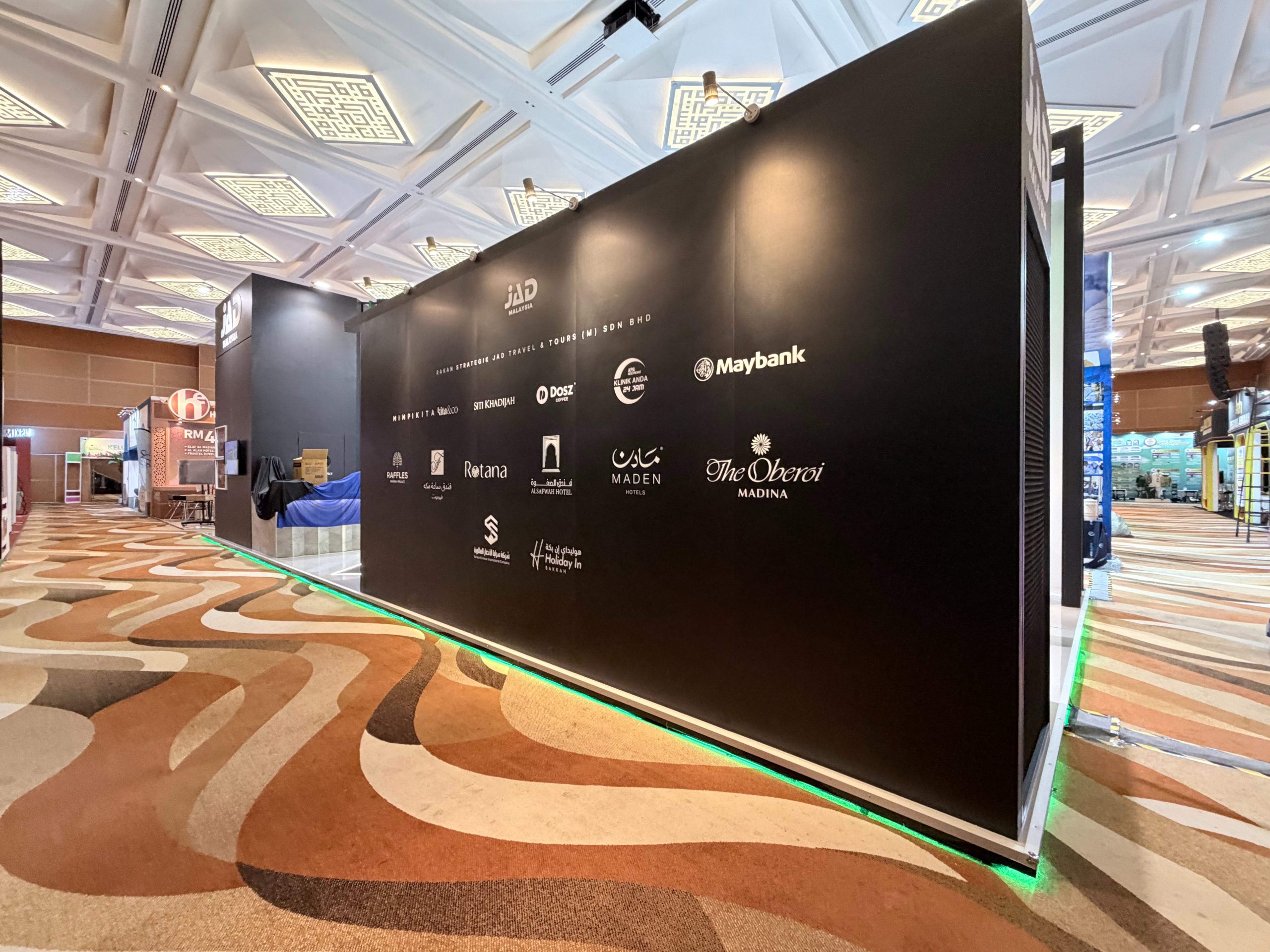 At the heart of the booth, a large digital display played a central role, showcasing real stories, moments, and memories from past pilgrims. This visual storytelling element transformed information into emotion, allowing visitors to imagine their own journey while reinforcing JAD’s credibility and long-standing commitment to service. The placement of the screen ensured visibility from afar, drawing visitors in organically.